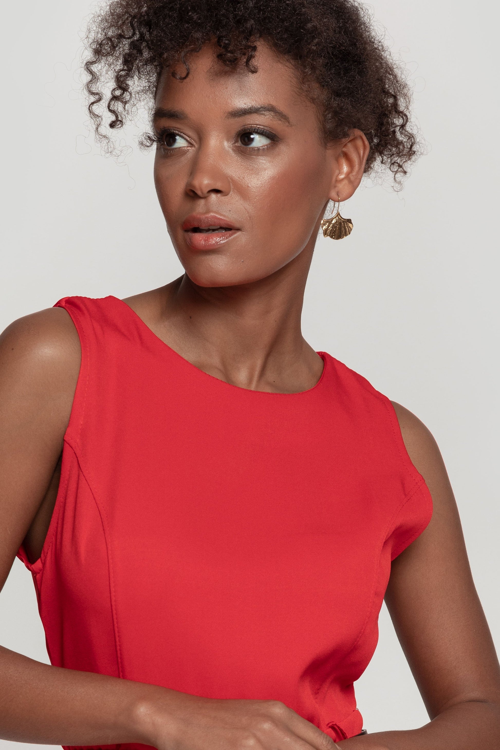 Tejido de acabado suave. Diseño semiajustado. Diseño fluido. Diseño midi. Cuello redondo. Manga sisa. Cierre de cremallera trasero. Detalles pliegues. Cinturón corazón. Talla modelo: S. Altura modelo 1,65 m.