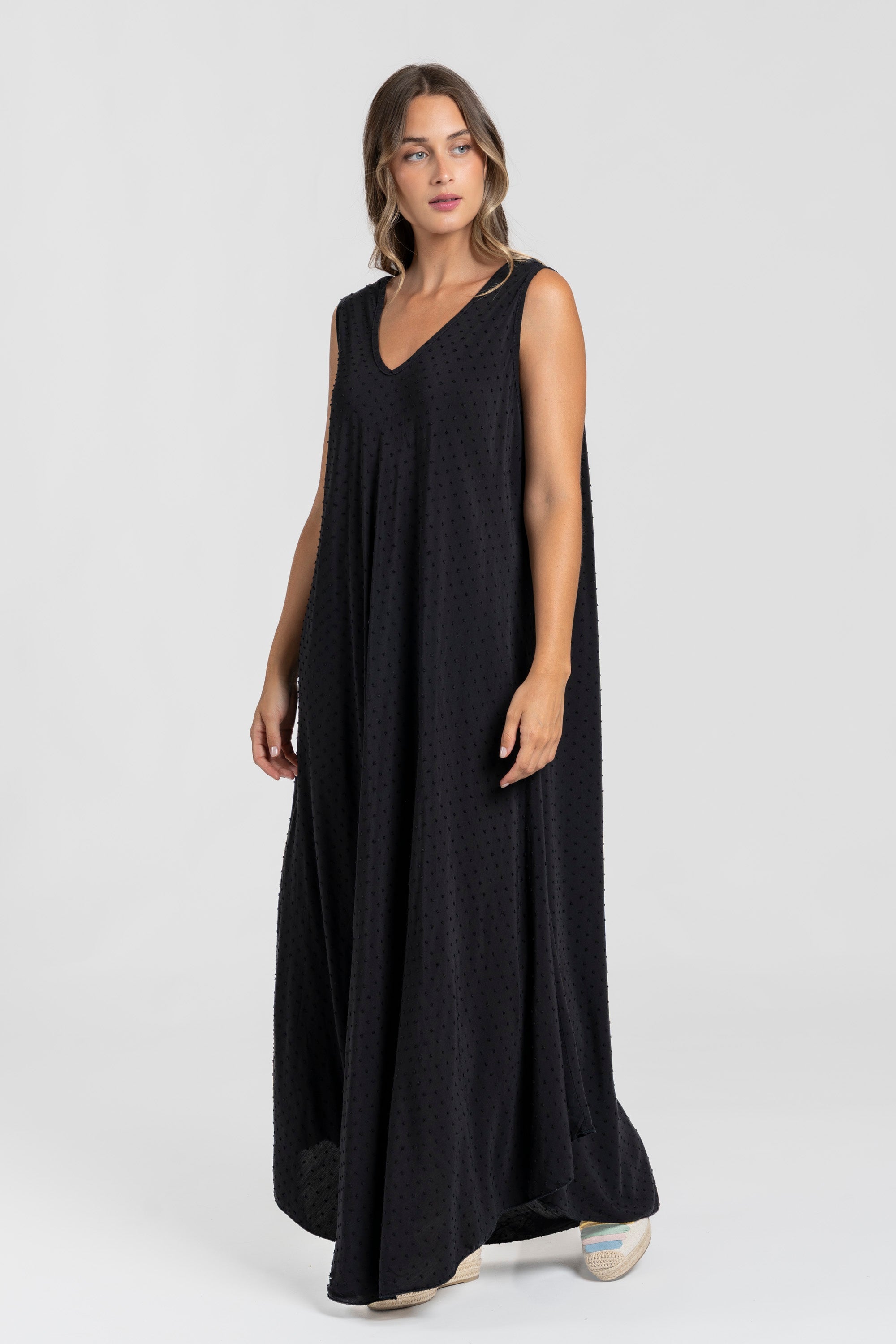 Tejido plumeti fluido. Tirantes anchos. Escote pico. Diseño super ancho. Talla única. Sisa a sisa 70cm. Largo 150cm. Desde una 42 hasta una 54.