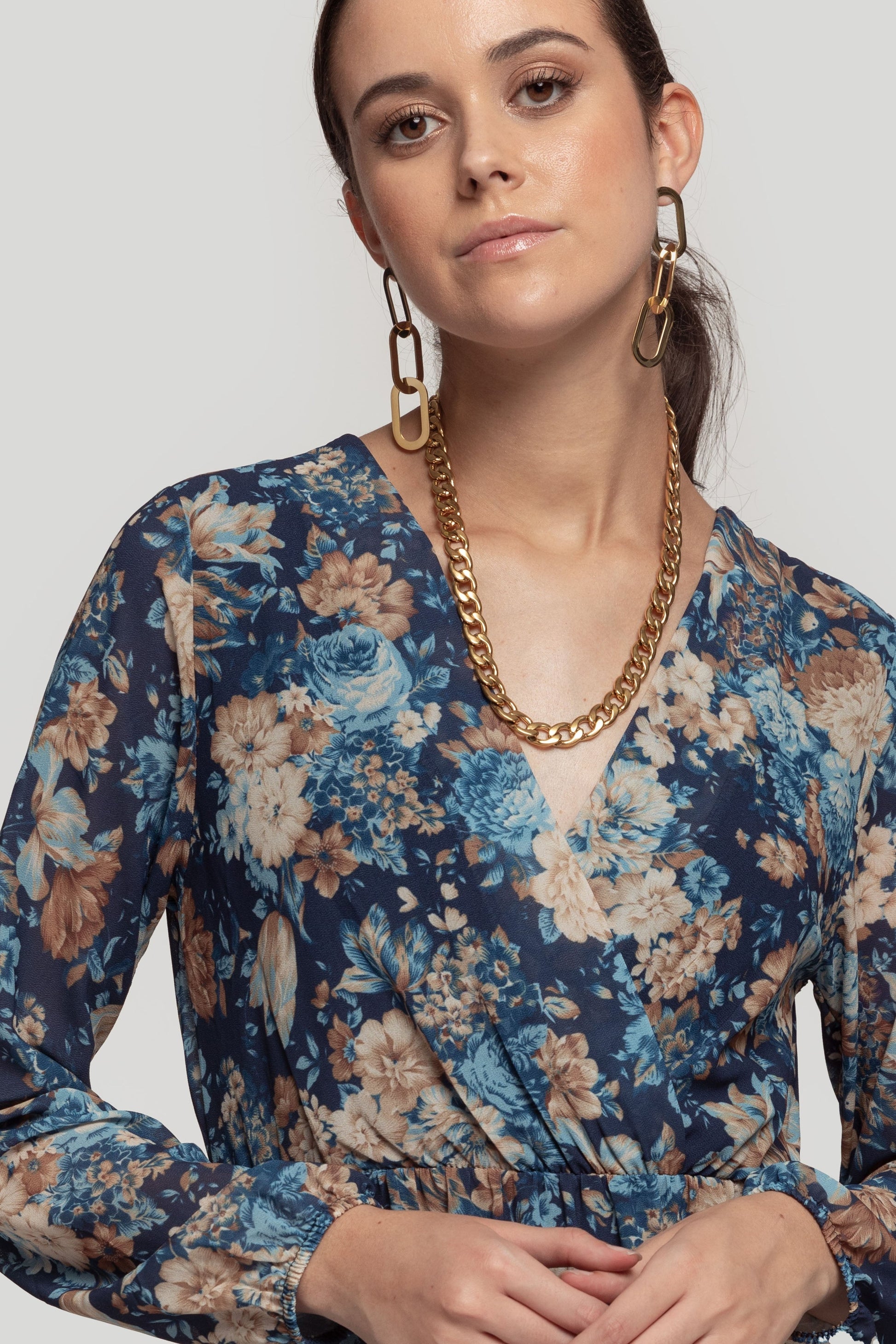 Tejido gasa. Diseño largo. Diseño evasé. Diseño estampado. Diseño cruzado. Cuello pico. Manga larga. Puño elástico. Cintura elástica. Forrado. Talla modelo: S. Altura modelo 1,66 m.