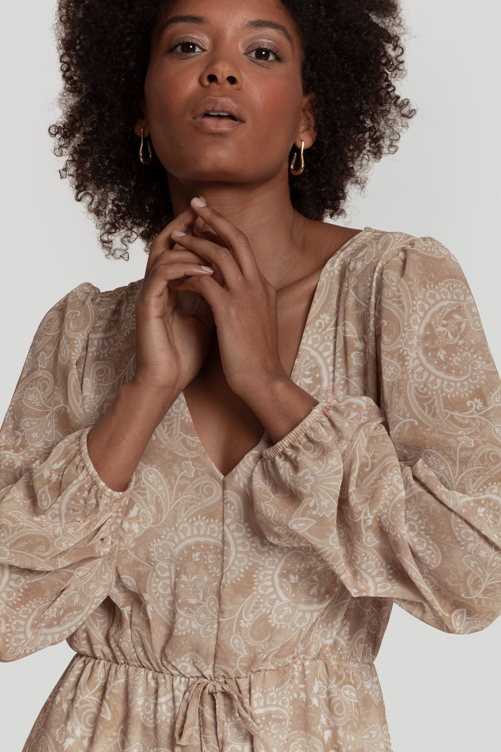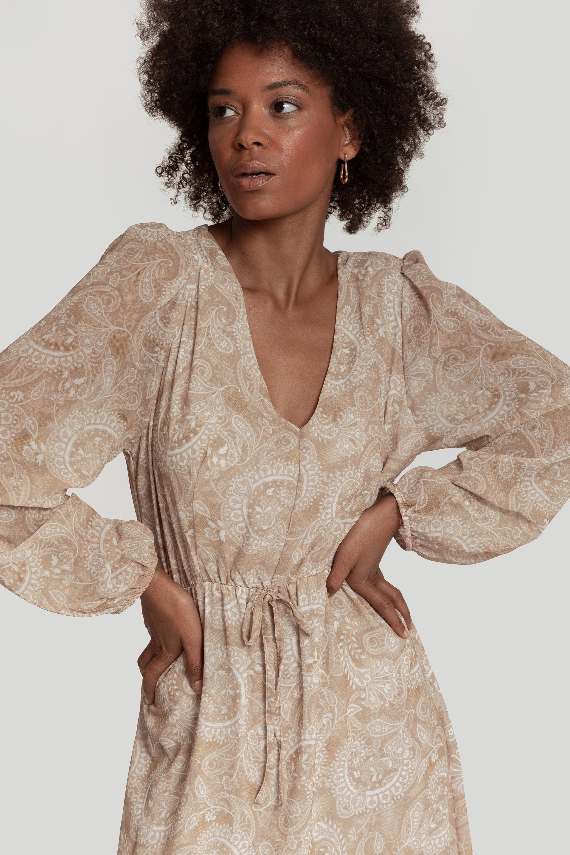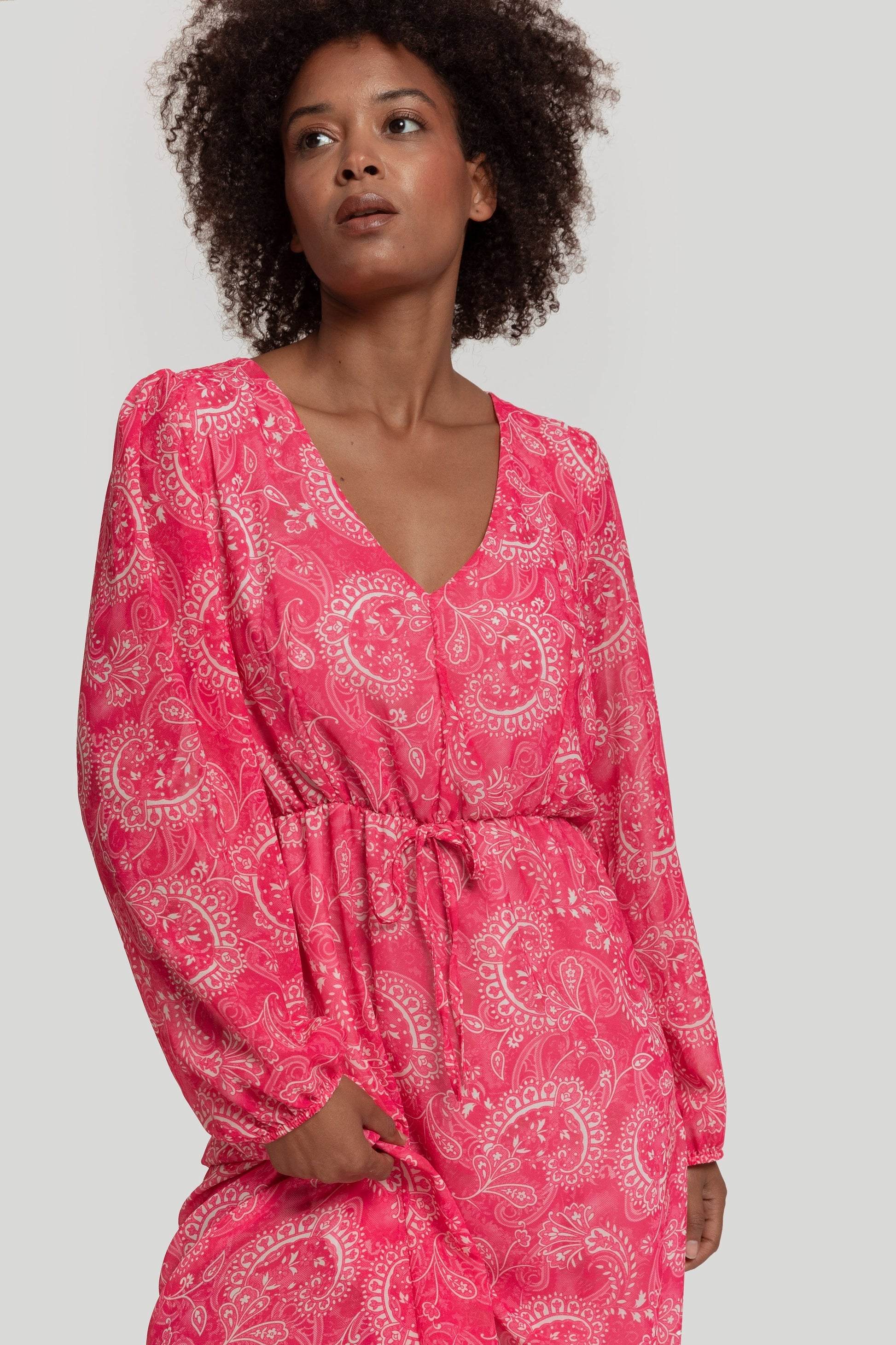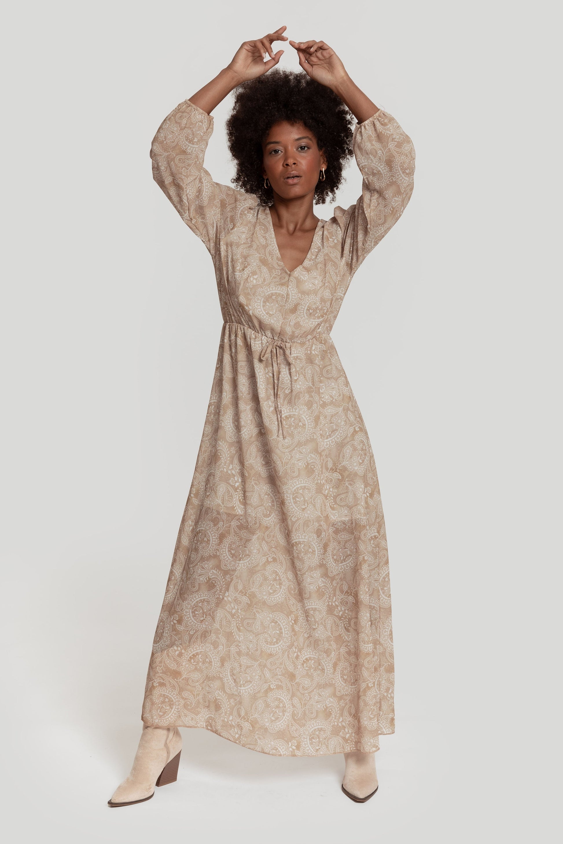 Tejido gasa. Diseño largo Diseño evasé. Diseño estampado. Cuello pico. Manga larga. Puño elástico. Cintura elástica. Detalle lazo. Forrado. Talla modelo: S. Altura modelo 1,65 m.
