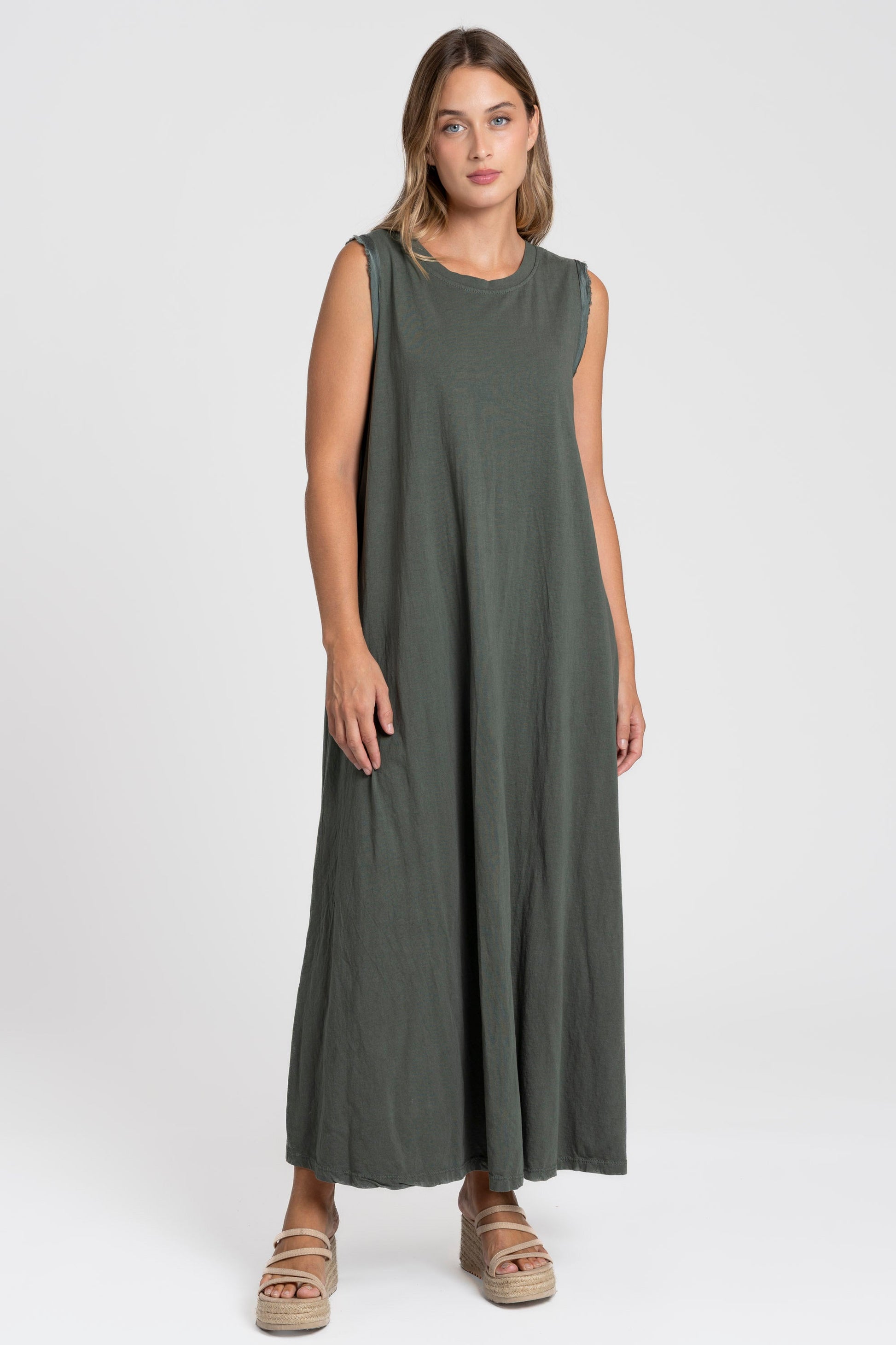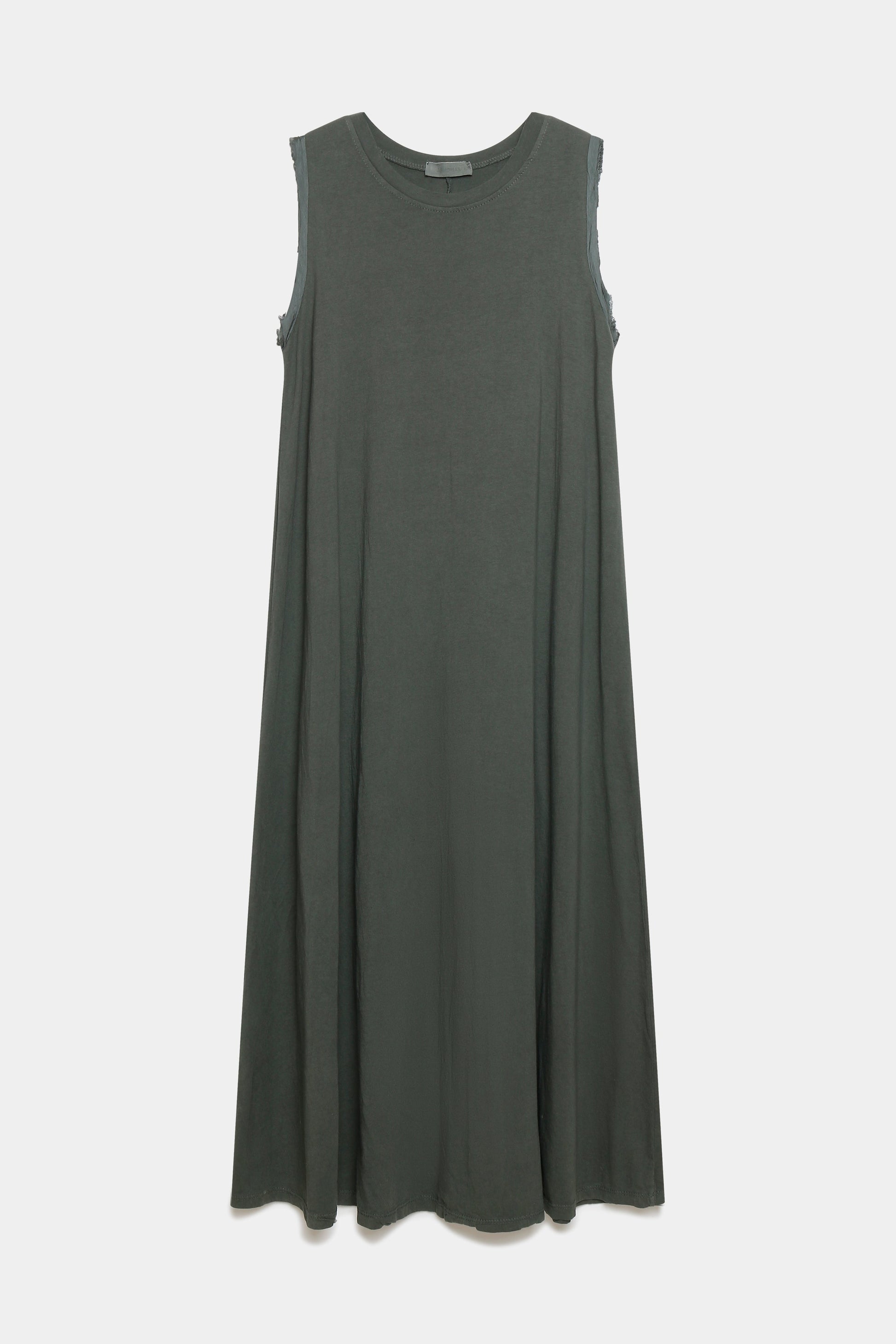 Tejido de algodón. Cuello redondo. Manga sisa. Diseño largo. Tejido raso combinado en la manga.