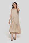 Vestido largo. Tejido fluido. Diseñp oversize. Diseño recto. Cuello redondo. Sin mangas. Bajo volante. Talla modelo: S. Altura modelo 1,67 m.