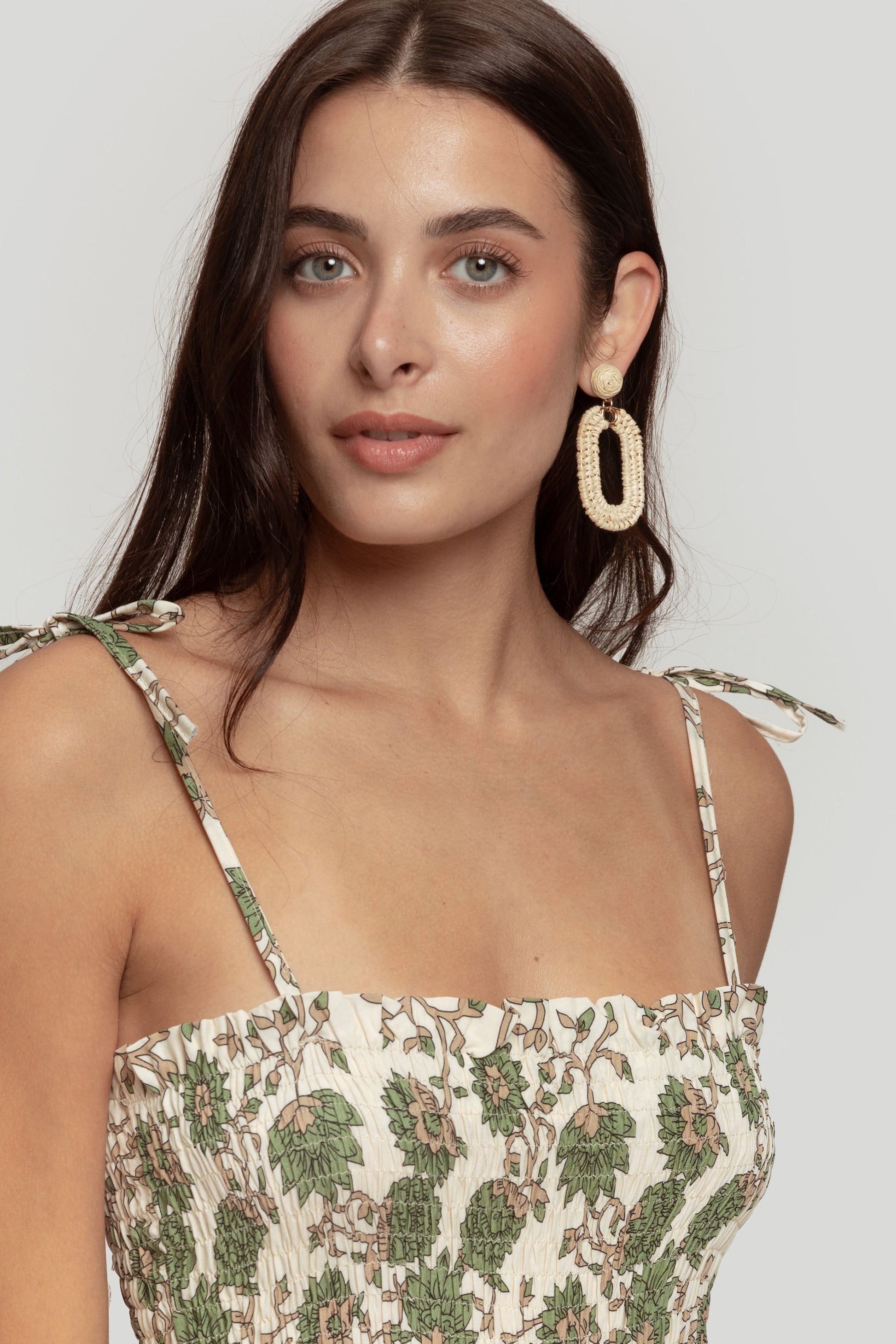 Tejido fluido. Diseño estampado. Diseño midi. Diseño evasé. Tirantes no ajustables. Panel elástico. Bajo volante. Talla modelo: S. Altura modelo 1.66 m.