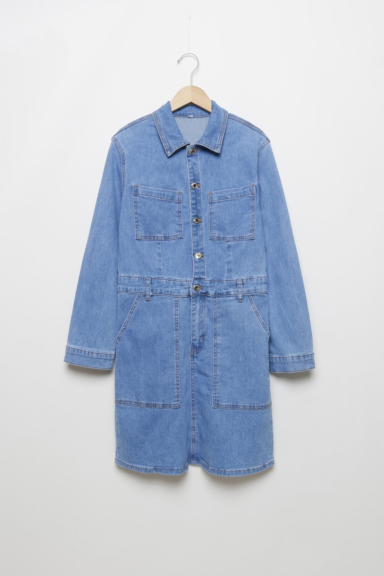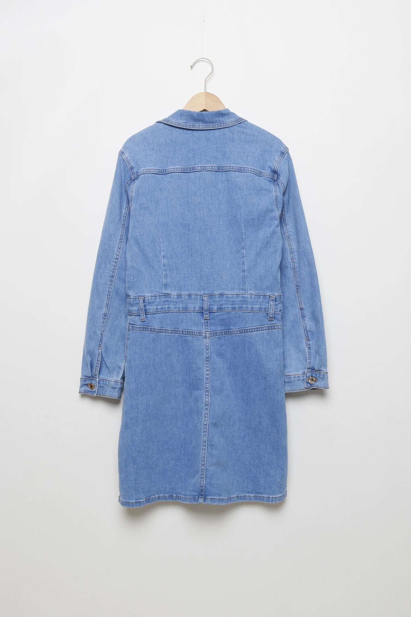Tejido mezcla de algodón. Tejido tejano vaquero. Diseño recto. Diseño corto. Cuello solapa. Manga larga. Puño abotonado. Cierre frontal de botones. Bolsillos laterales. Cinturilla con trabilla. Talla modelo: S. Altura modelo 1,66 m.