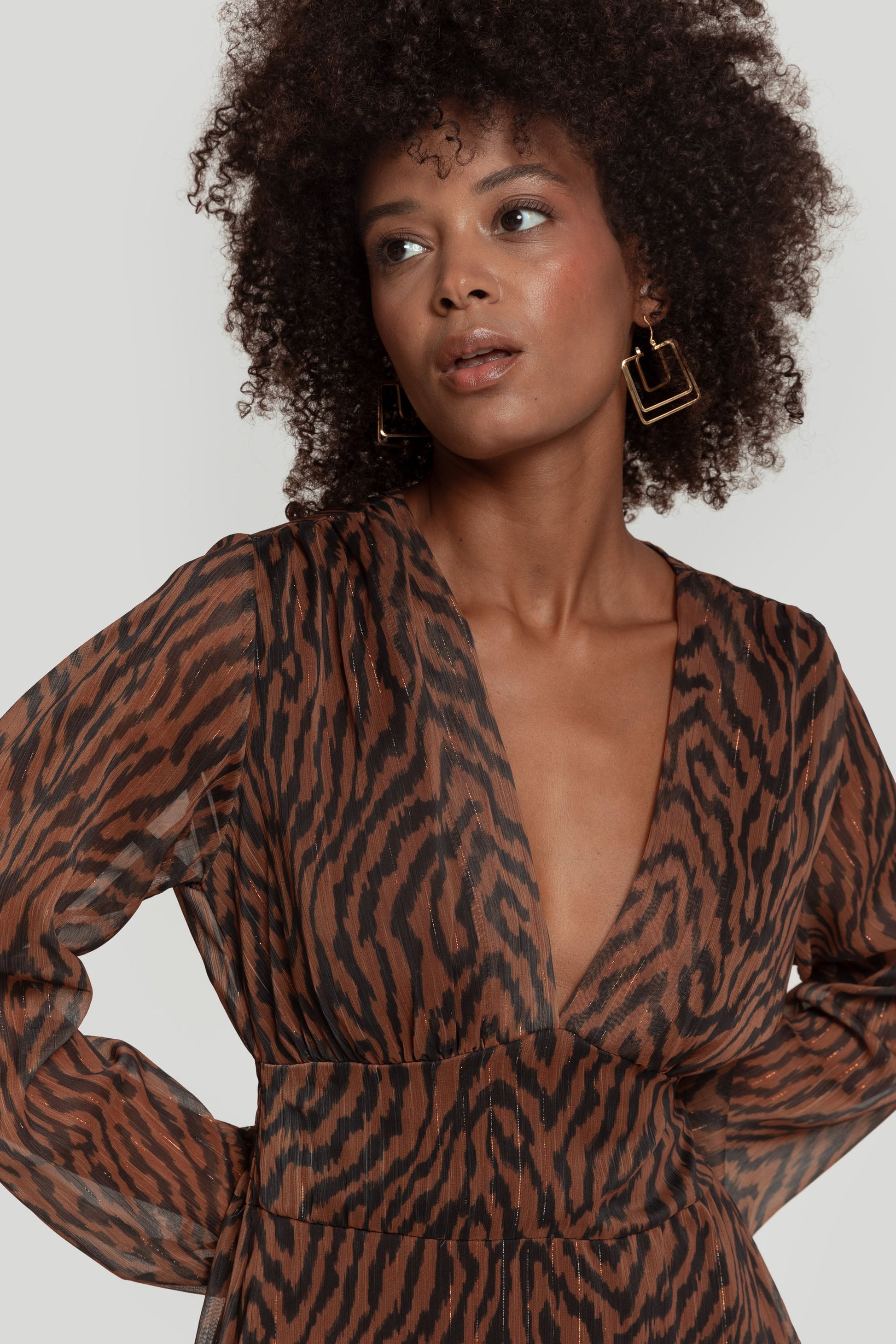 Tejido gasa. Diseño estampado. Diseño midi. Cuello pico. Manga larga. Puño elástico. Elástico en espalda. Trama brillante. Forrado. Talla modelo: S. Altura modelo: 1.66 m.