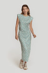 Tejido sedoso. Diseño estampado. Diseño ajustado. Diseño midi. Cuello redondo. Manga sisa. Hombreras. Talla modelo: S. Altura modelo 1,70 m.