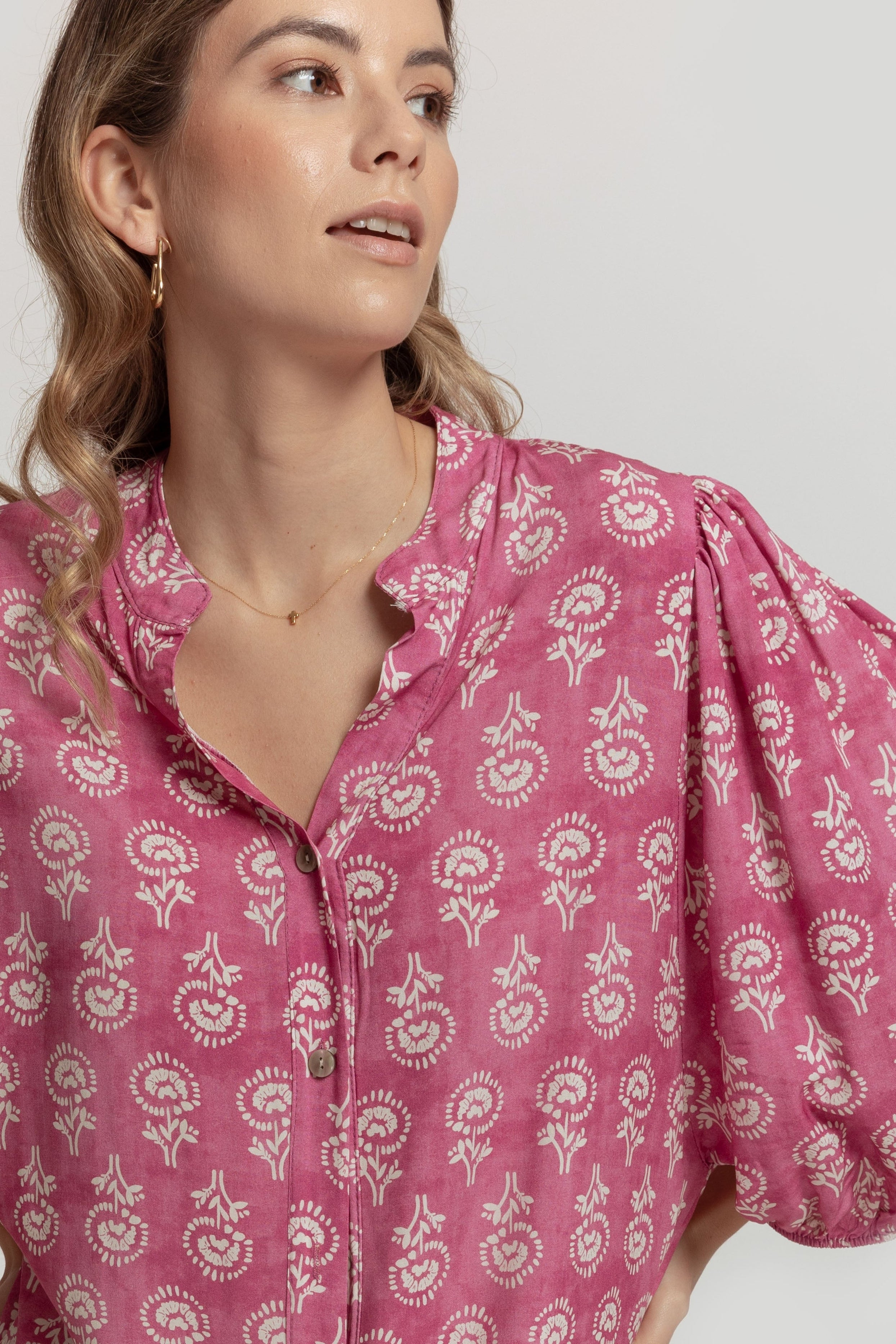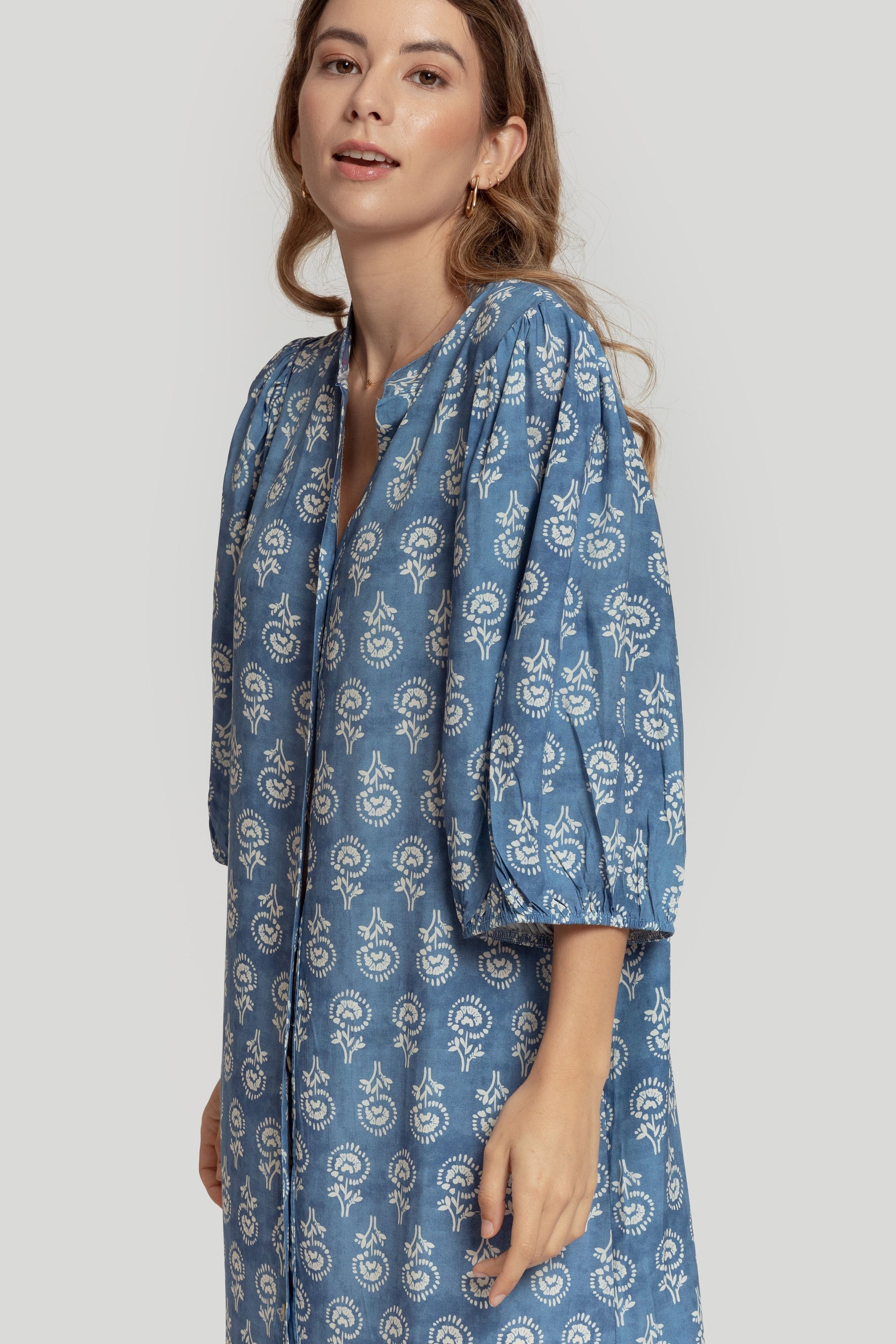 Tejido fluido. Diseño oversize. Diseño largo. Diseño recto. Cuello pico. Cuello redondo. Manga corta. Cierre de botones. Bajo volante. Talla modelo: S. Altura modelo 1,70 m.