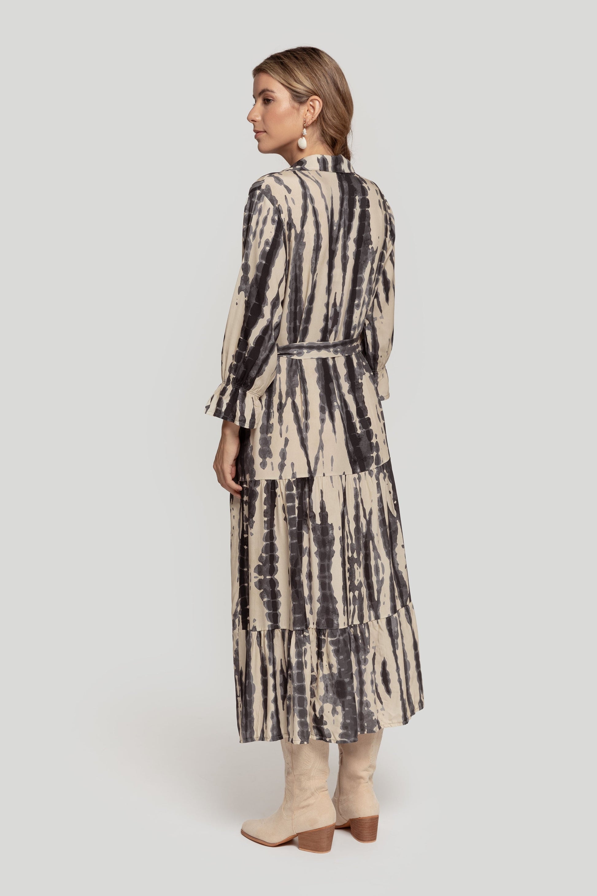 Tejido fluido. Diseño estampado. Diseño largo. Diseño evasé. Estilo camisero. Cuello solapa. Manga tres cuartos con acabado elástico. Cierre de botón. Cinturón a contraste. Bajo volante. Talla modelo: S. Altura modelo 1,70 m.
