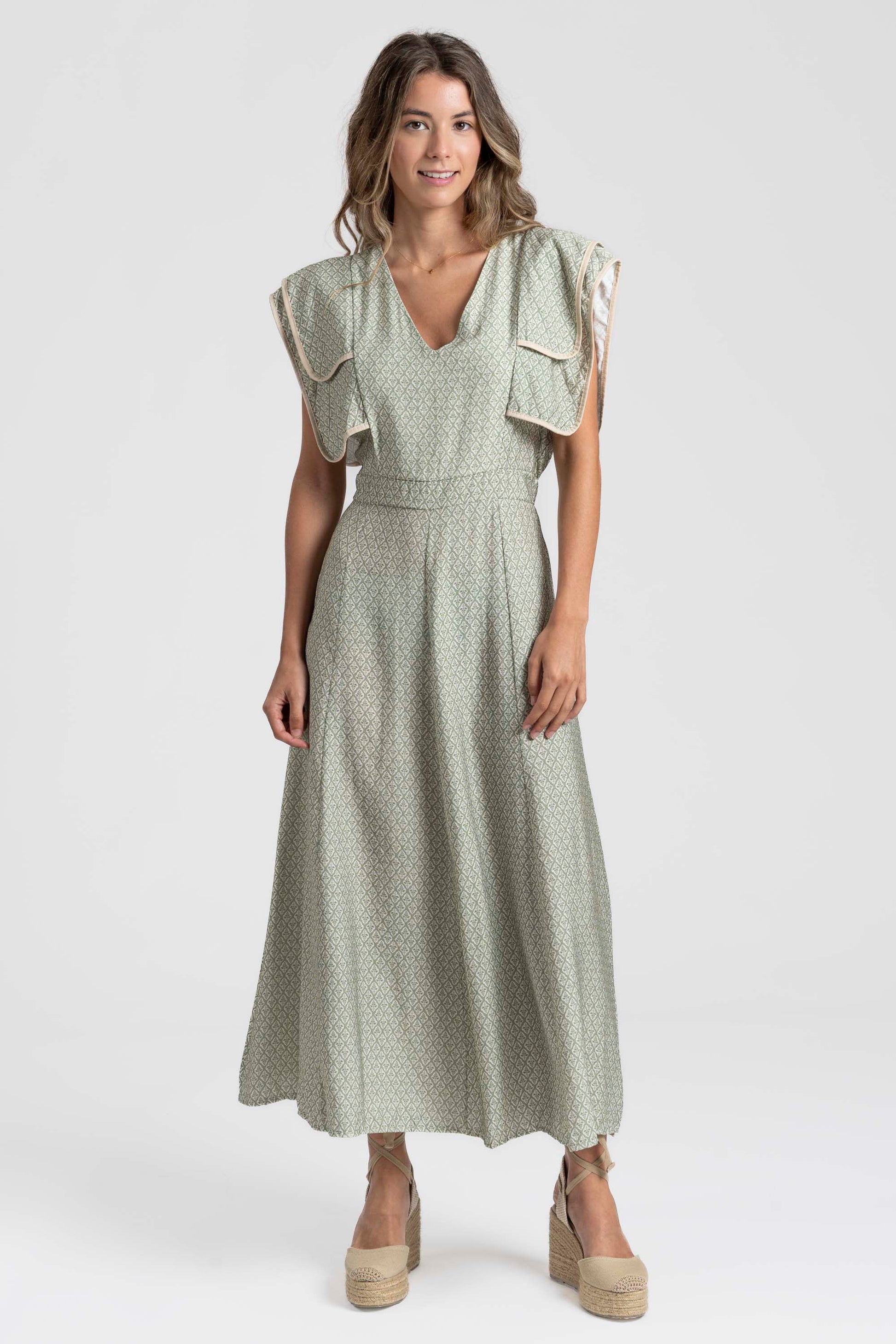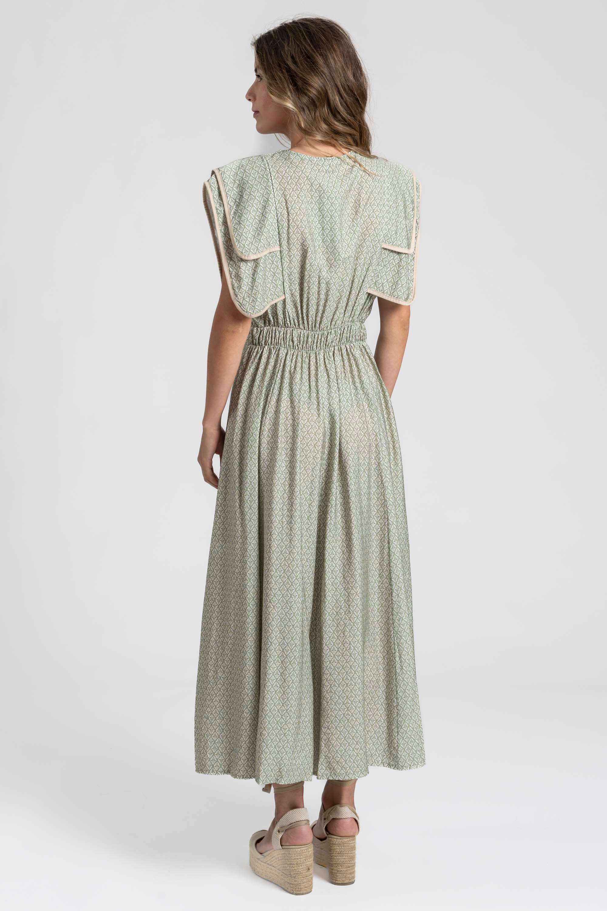 Tejido fluido. Diseño estampado. Cuello pico. Manga sisa.