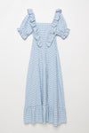Tejido mezcla de algodón. Diseño estampado vichy. Diseño evasé. Diseño largo. Escote cuadrado. Cuello bobo. Manga corta. Detalle volante. Talla S. Altura modelo: 1.70 m