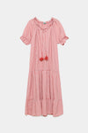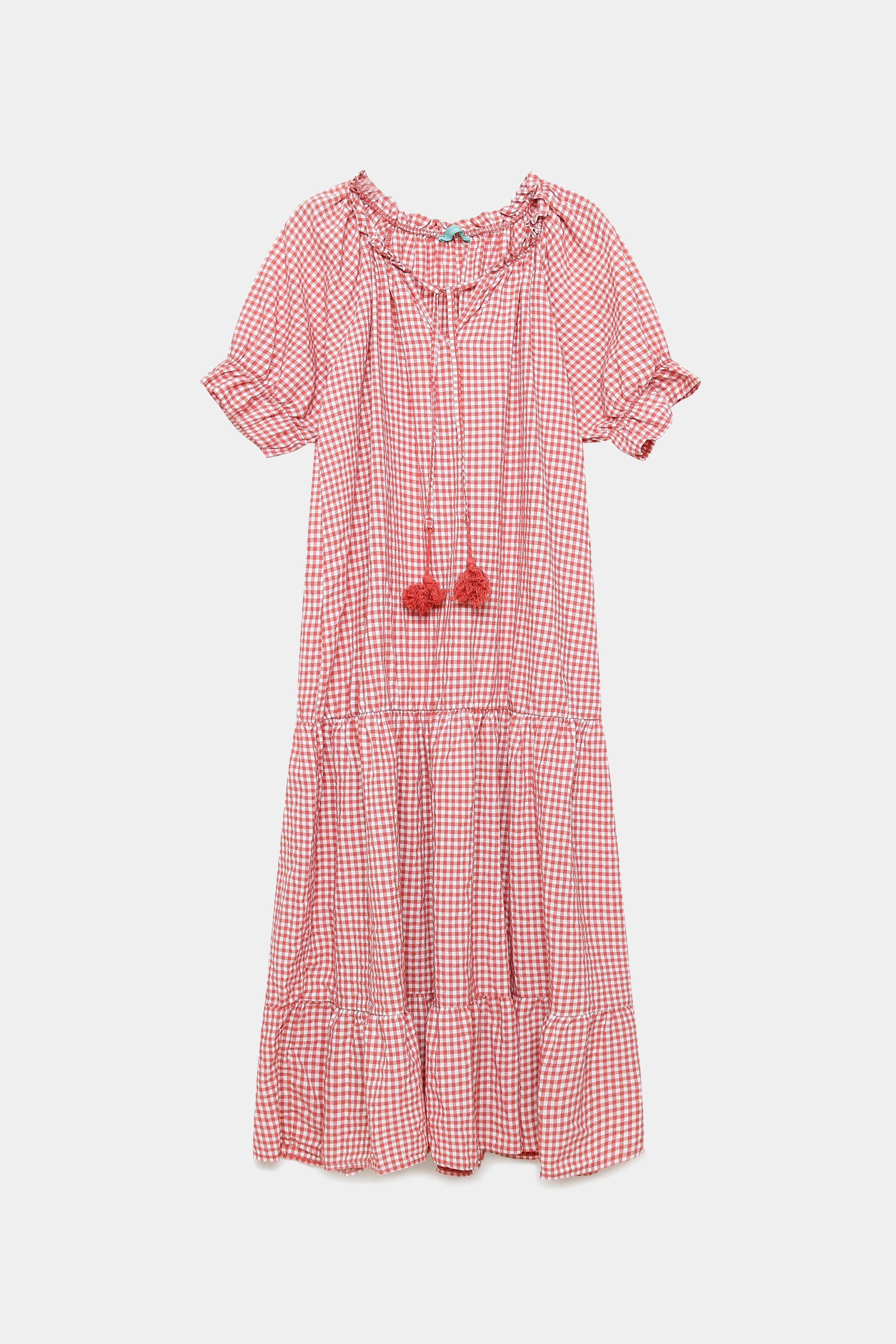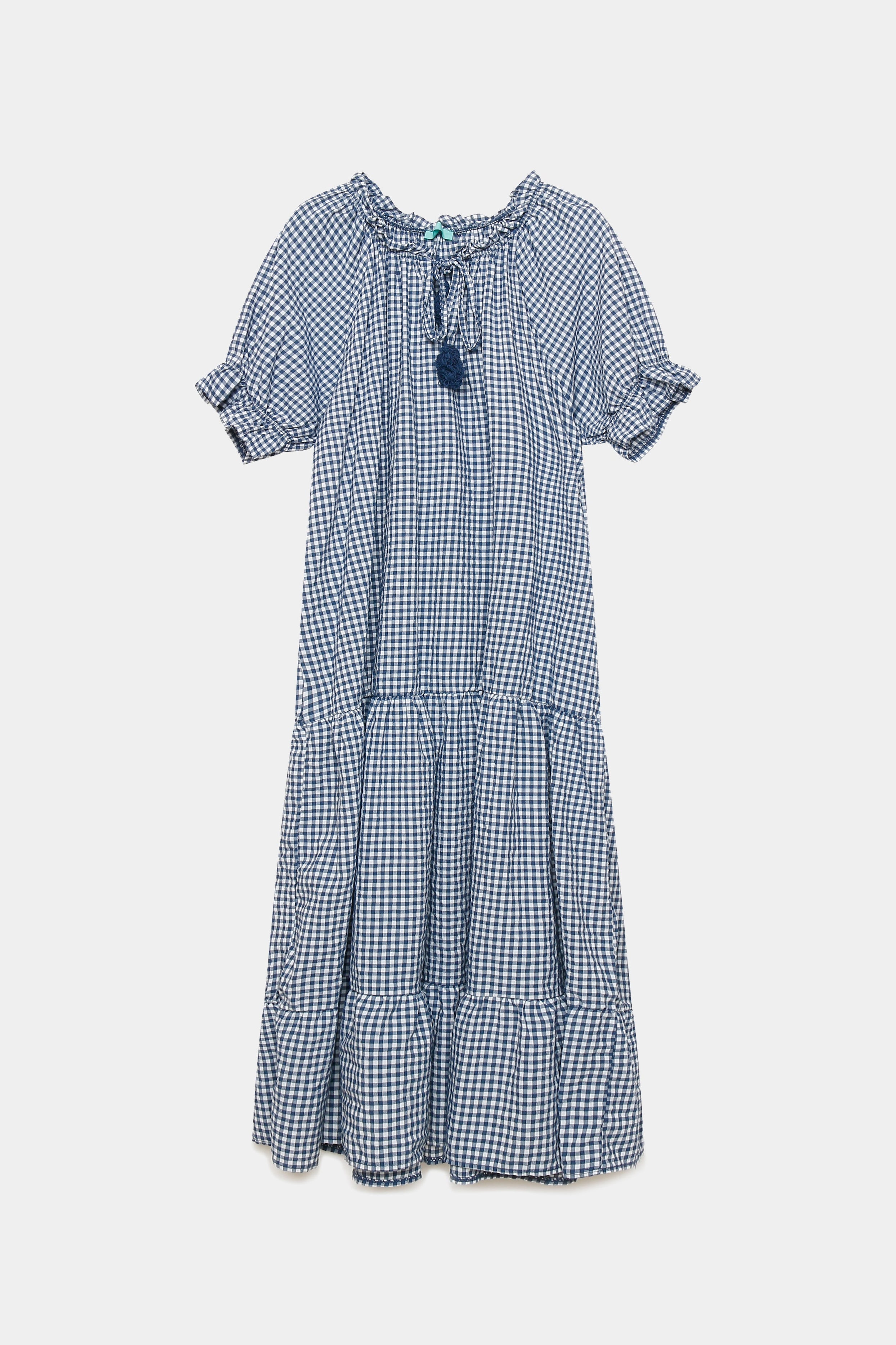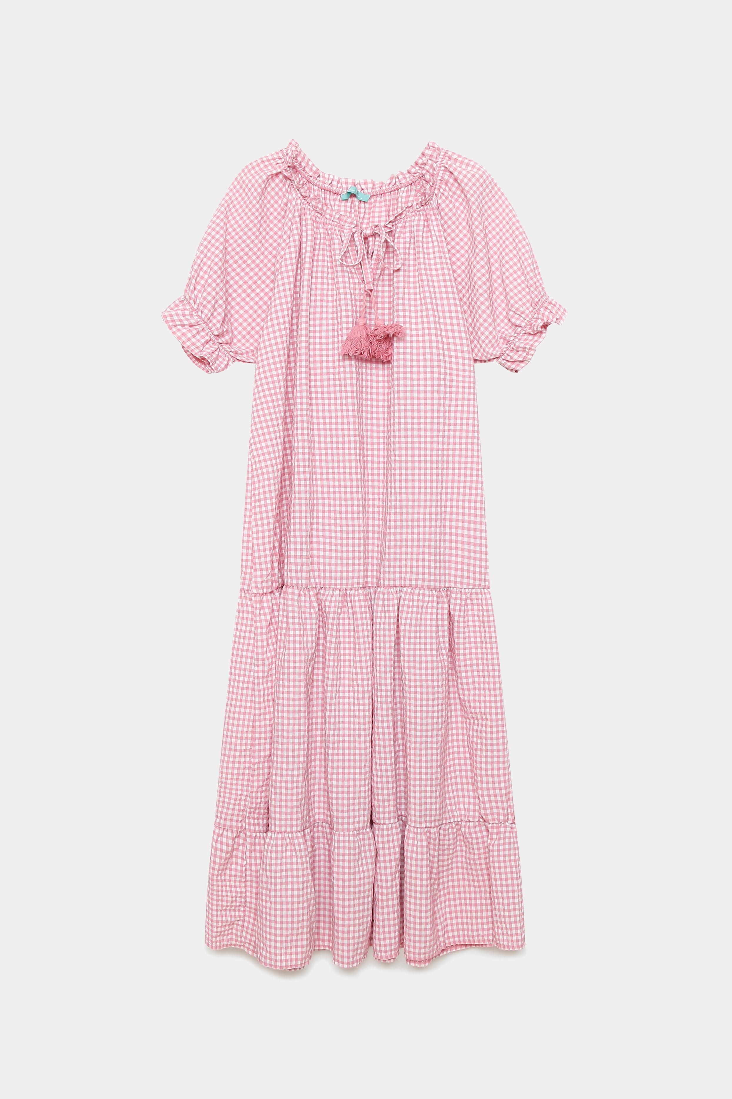 Tejido mezcla de algodón. Diseño estampado vichy. Diseño evasé. Diseño largo. Escote pico. Manga corta. Detalle volante.