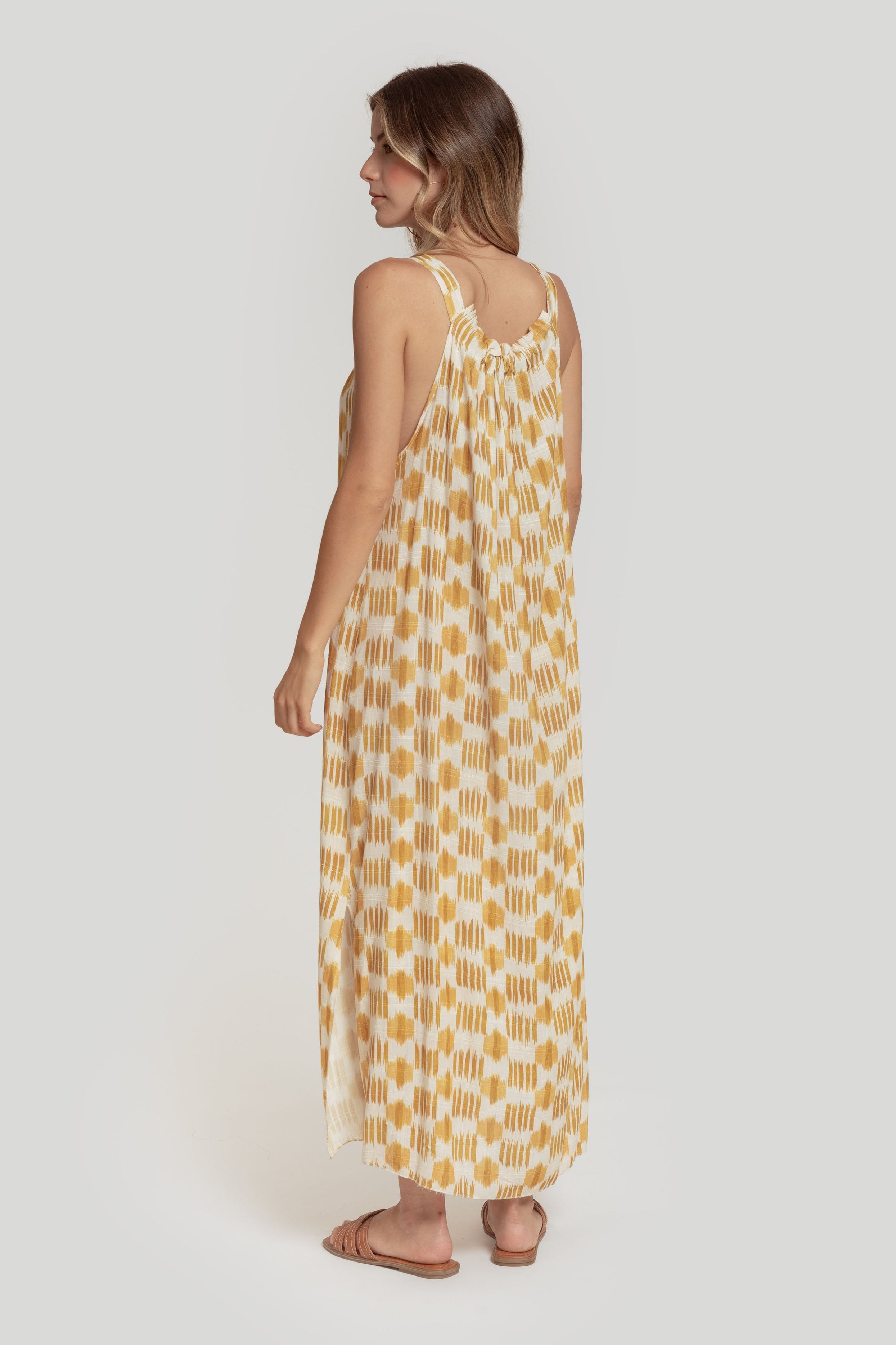 Tejido textura. Diseño estampado. Diseño fluido. Diseño largo. Cuello halter. Tirantes finos. Espalda descubierta. Lazo en el cuello. Bajo con aberturas. Talla modelo: S. Altura modelo 1,70 m.