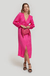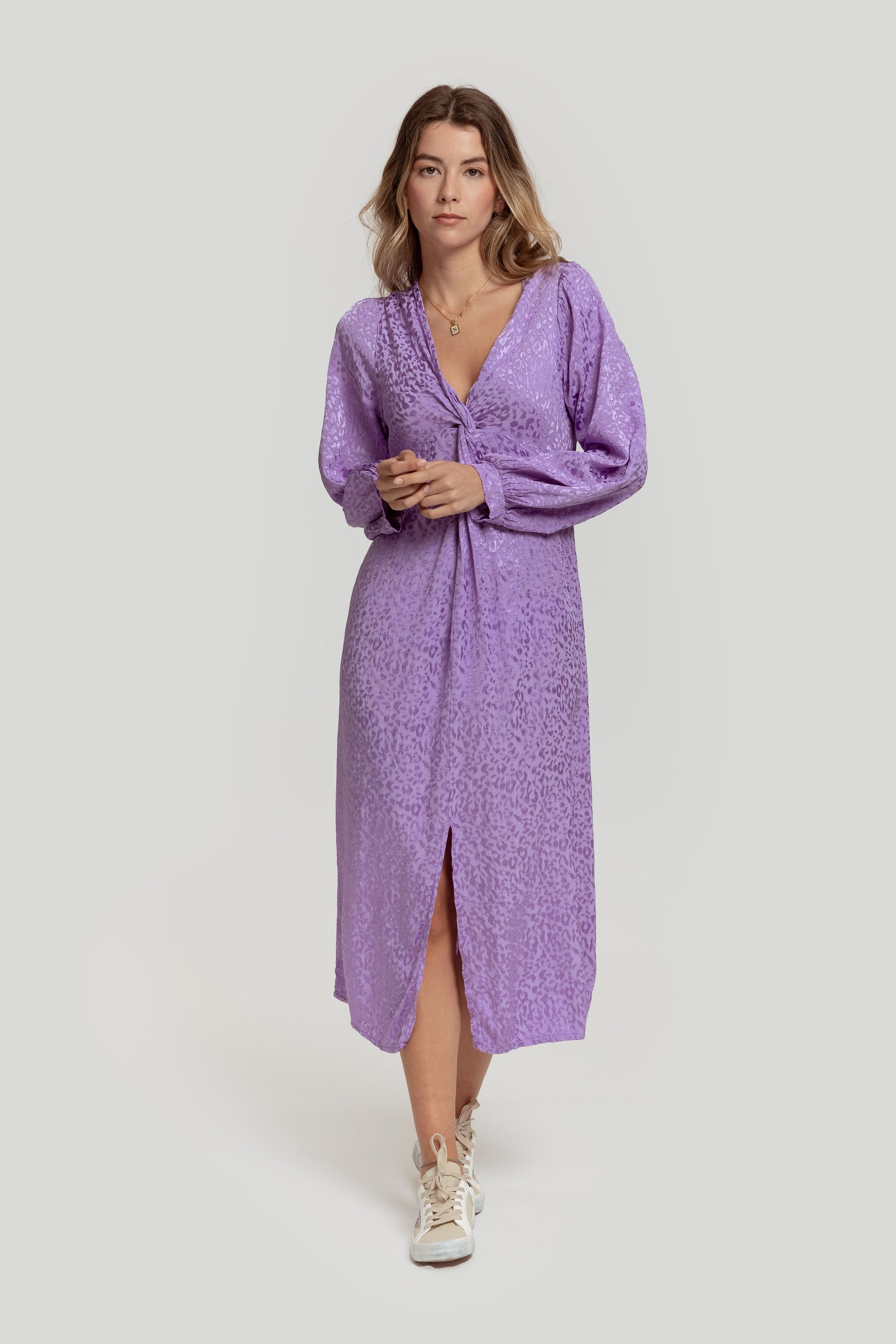 Vestido midi. Tejido satinado. Diseño estampado. Diseño recto. Diseño evasé. Cuello pico. Manga larga. Costura bajo el pecho. Detalle nudo. Abertura frontal. Talla modelo: S. Altura modelo 1,70 m.