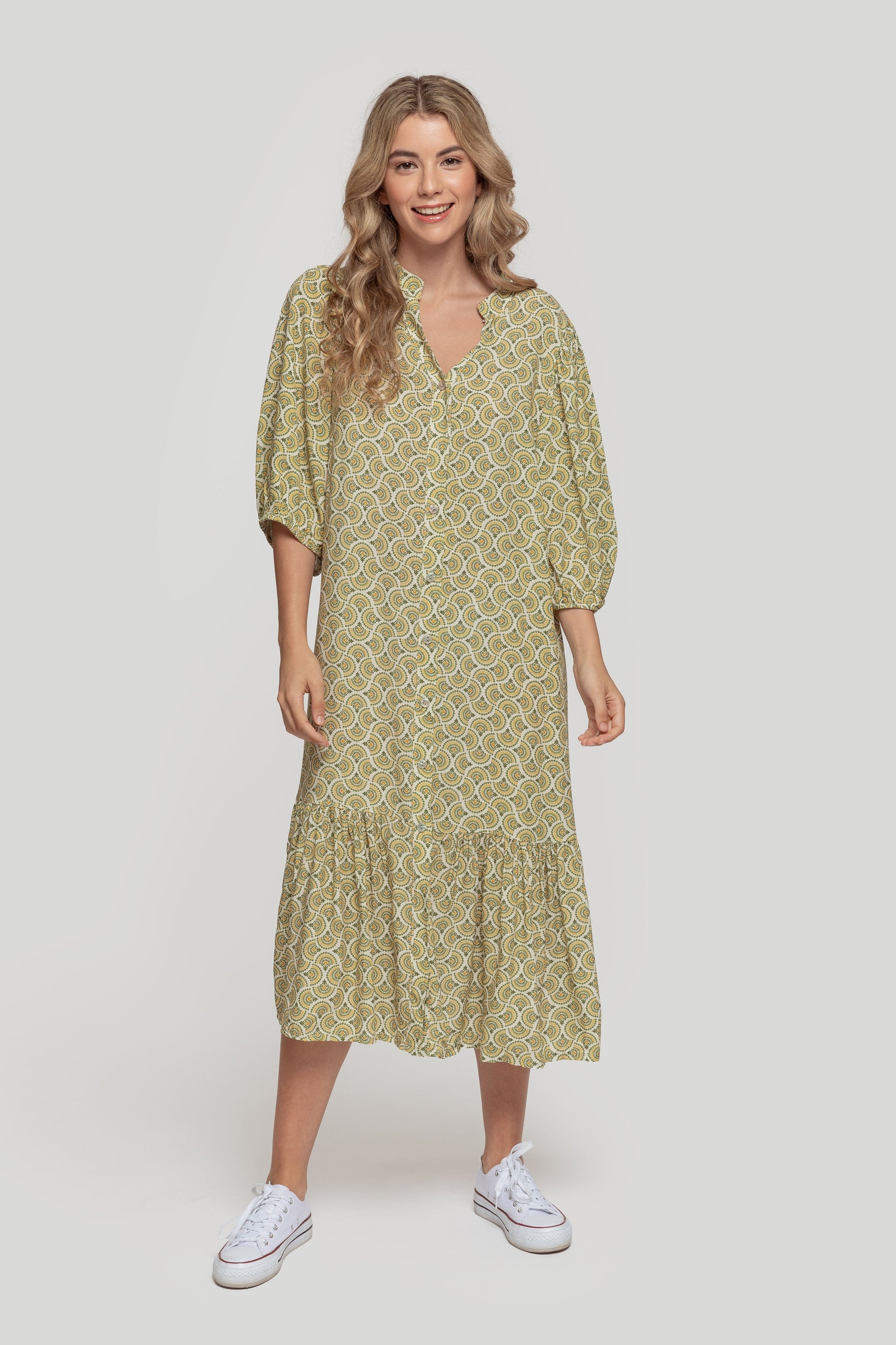 Tejido ligero. Diseño recto. Diseño estampado. Diseño amplio. Cuello pico. Manga corta. Manga amplia. Cierre de botones. Bajo volante. Talla modelo: S. Altura modelo 1,70m.