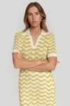 Tejido punto. Tejido calado. Diseño recto. Diseño polo. Diseño midi. Cuello pico. Manga corta. Talla modelo: S. Altura modelo 1,70 m.