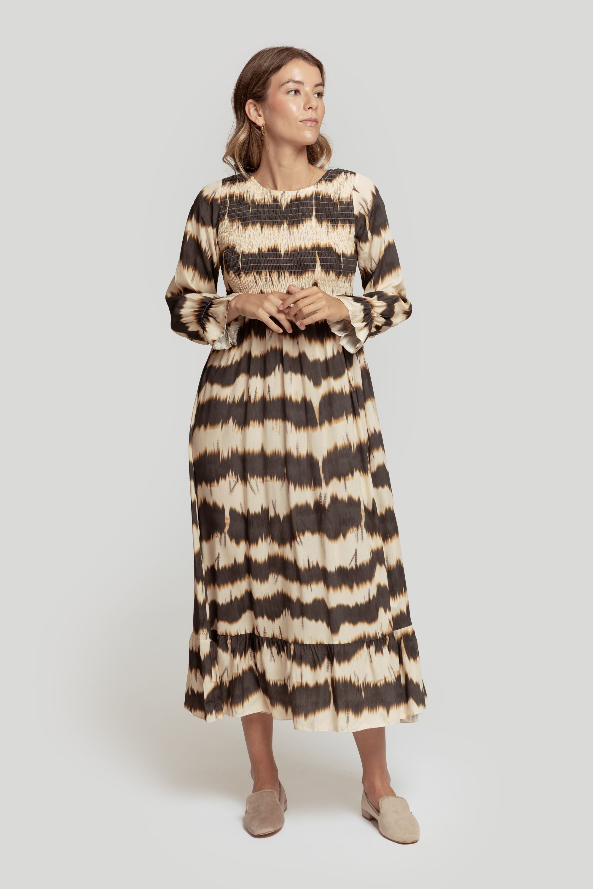 Tejido fluido. Diseño largo. Diseño evasé. Diseño estampado. Cuello redondo. Manga larga. Puño acampanado. Panel elástico. Abotonado en cuello. Bajo volante. Talla modelo: S. Altura modelo 1,70 m.